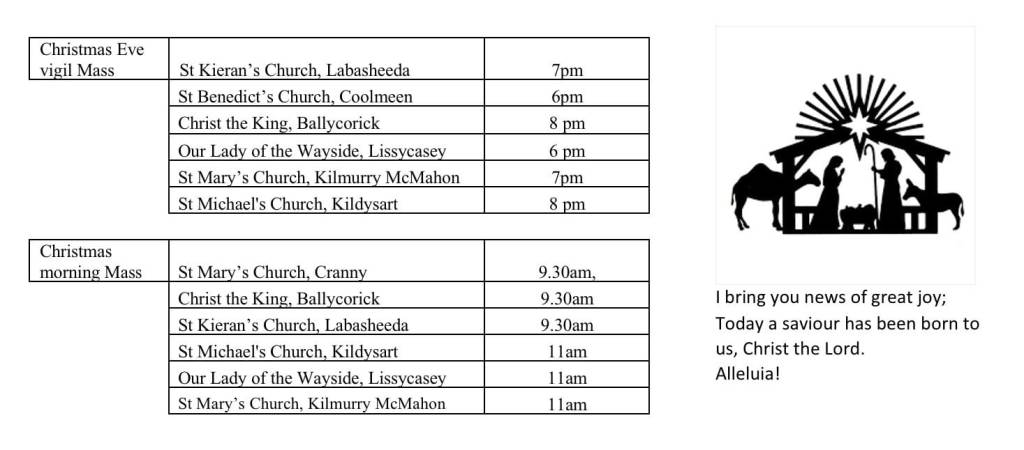 Christmas night Mass will be celebrated in St Michael’s Church, Kildysart at 8pm on Sunday. Christmas morning Mass will be celebrated in St Michael’s Church, Kildysart at 11am on Monday.